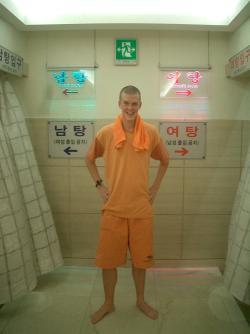 Kaum kommt man um die nächste Ecke der erste Schock. Ca. 6-10 Koreaner sitzen oder stehen vor einem Fernseher und schauen den Nationalsport, Baseball - NACKT. Das Grinsen musste ich mir verkneifen, denn als ich den Raum mit Daniel (Austauschstudent aus Schweden, groß, blond, blass) betrat, war nicht der Fernseher sondern plötzlich wir Mittelpunkt des Geschehens. Eine kurze Begrüssung in Verbindung mit einer leichten Verbeugung und wir wurden akzeptiert.